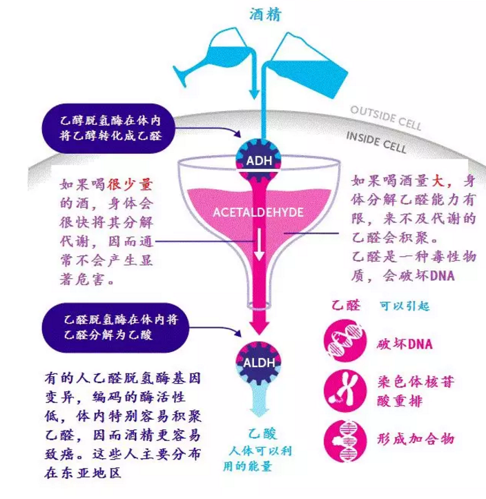 酒精的代谢产物“乙醛”是一级致癌物,因为乙醛能直接结合DNA,诱发基因突变。
